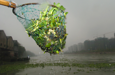 11月29日,河道養(yǎng)護(hù)人員正把一袋水葫蘆從運(yùn)河中撈起。盡管工作人員的奮力打撈,但水葫蘆還是逼近了杭州市中心。近段時(shí)間來(lái),由于運(yùn)河杭州段支線的鄉(xiāng)村河流水質(zhì)富營(yíng)養(yǎng)化嚴(yán)重,導(dǎo)致水葫蘆大面積生長(zhǎng)蔓延,加上今年的暖冬天氣,為水葫蘆的生長(zhǎng)提供了環(huán)境,加速了水葫蘆的繁殖速度。目前,水葫蘆的瘋長(zhǎng)已經(jīng)對(duì)運(yùn)河的行船安全造成了隱患。