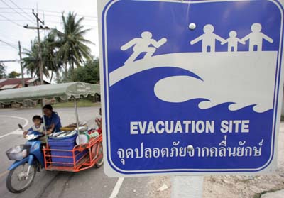 在泰國攀牙府,當(dāng)?shù)鼐用耱T摩托車經(jīng)過海嘯警示牌。印度洋海嘯發(fā)生近兩年來,受災(zāi)各國采取各種預(yù)警方式,降低災(zāi)難風(fēng)險。