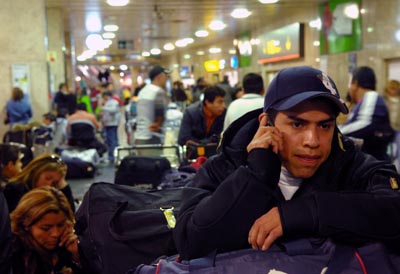 12月19日,在西班牙首都馬德里,馬德里航空公司的滯留旅客通過手機(jī)與家人聯(lián)系。馬德里航空公司15日宣布暫時(shí)中止?fàn)I運(yùn),造成大批旅客滯留。盡管西班牙有關(guān)部門啟動(dòng)了應(yīng)急措施,但截至19日晚,仍有大批旅客滯留機(jī)場(chǎng),亟待安置。