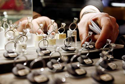 22日,在美國(guó)紐約第47大街西部的一家珠寶店,一名珠寶商整理待售的鉆戒。紐約第47大街是傳統(tǒng)鉆石珠寶店匯集的地方。隨著互聯(lián)網(wǎng)在線(xiàn)鉆石銷(xiāo)售公司的迅速發(fā)展,這些傳統(tǒng)珠寶店的經(jīng)營(yíng)受到強(qiáng)大的沖擊。據(jù)報(bào)道,一家總部設(shè)在西雅圖的在線(xiàn)鉆石銷(xiāo)售公司2006年的銷(xiāo)售收入估計(jì)達(dá)到2.5億美元,而6年前僅為4400萬(wàn)美元。