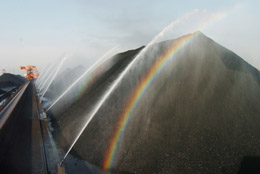 1月25日,秦皇島港使用經(jīng)環(huán)保設(shè)備處理的中水對(duì)煤堆進(jìn)行“洗澡”防塵。