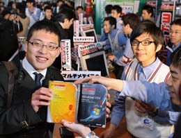 視窗Vista操作系統(tǒng)1月30日零時(shí)在日本全國(guó)同步發(fā)售,但購(gòu)買(mǎi)了這種產(chǎn)品的用戶報(bào)告說(shuō),他們安裝Vista操作系統(tǒng)后,不能使用部分網(wǎng)絡(luò)銀行服務(wù),也不能正常使用電子郵件。圖為1月30日,在日本東京,買(mǎi)到視窗Vista的日本消費(fèi)者展示手中的產(chǎn)品。 |