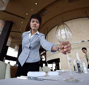 10日,服務(wù)員在泰國(guó)曼谷的一家餐廳擺放餐具。泰國(guó)近日推出11道菜的天價(jià)節(jié)日套餐,價(jià)格高達(dá)每人29000美元。新華社/法新