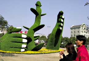 經(jīng)濟“幼苗”的成長,需要人類之手的呵護。浙江省臺州市路橋區(qū)石浜公園內12米高的“幼苗”和“巨手”造型吸引游客駐足觀看。新華社發(fā) 陳林聰 攝