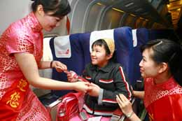 2月14日下午4時,2007年上海航空公司首架兩岸春節(jié)包機(jī)——上航9501次波音767客機(jī)搭載著258名臺胞飛往臺北。圖為兩位空姐在向一位小乘客贈送禮品。