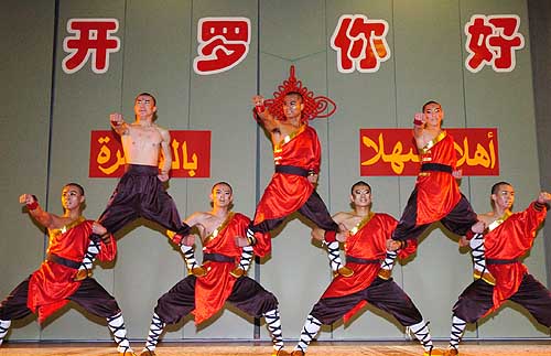 23日晚,中國藝人在埃及首都開羅國際會議中心表演中國功夫。當日,來自北京八大廟會之一廠甸廟會的藝人們在這里為當?shù)厝罕姭I上了一場北京春節(jié)廟會特有的傳統(tǒng)民間藝術(shù)表演。這是中國春節(jié)廟會演出首次在埃及登臺亮相。