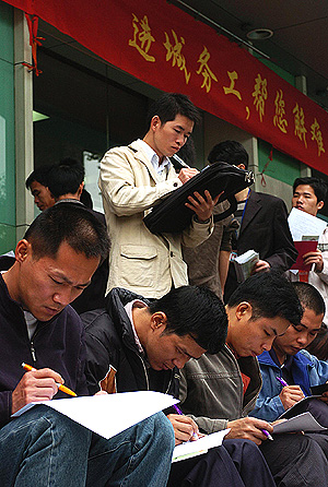 2月28日,幾位青年在廣州市勞動力市場服務(wù)中心前填寫應(yīng)聘表格。 廣東省勞動部門近期對全省303家企業(yè)用工定點抽樣調(diào)查顯示,2006年廣東省六成企業(yè)嚴(yán)重缺工,勞動力市場需求為729.92萬人次,而求職者只有482.24萬人次。