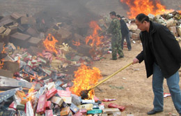 3月14日,工作人員在焚燒假冒偽劣商品。當(dāng)日,青海省工商行政管理部門展開全省銷毀假冒偽劣商品統(tǒng)一行動,總案值近300萬元的假冒偽劣食品、藥品、煙、酒、書籍、光盤等被銷毀。