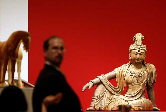 15日,一尊中國木雕造像在美國紐約克里斯蒂拍賣行展出。這尊“水月觀音”木雕造像是中國11至13世紀(jì)的作品,預(yù)計拍價在60萬至80萬美元。紐約克里斯蒂拍賣行將于3月22日拍賣中國古董,拍品包括木雕、陶瓷器、玉器、服飾等,總拍價預(yù)計將超過1200萬美元。