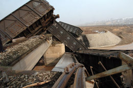 3月18日15時40分許,由烏魯木齊北約70公里的阜康開往烏魯木齊火車北站的專線運(yùn)煤列車在阜康市境內(nèi)經(jīng)過一鐵路橋梁時,橋梁坍塌,機(jī)車頭后部有九節(jié)運(yùn)煤車廂脫軌,其中八節(jié)側(cè)翻,三節(jié)墜落河中。截至當(dāng)日17時,沒有人員傷亡的報(bào)告。目前烏魯木齊鐵路局和阜康市有關(guān)部門已趕到現(xiàn)場處理事故。事故原因尚在進(jìn)一步調(diào)查中。 |