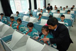 3月19日,濟南市市中區(qū)教育局實施的“推進農(nóng)村教育振興行動”計劃興建的第一所小學(xué)——秀山小學(xué)落成開學(xué)。 秀山小學(xué)投資650萬元,設(shè)有實驗室、圖書閱覽室、電教室等,共接收附近九個自然村的400名學(xué)生入學(xué)。該校的落成,解決了偏遠山區(qū)學(xué)校分散、孩子上學(xué)路途遠等問題,改善了農(nóng)村學(xué)校辦學(xué)條件,優(yōu)化了教育資源配置。 圖為秀山小學(xué)教師在教孩子使用電腦。 |