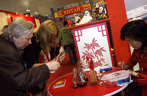 19日,在俄羅斯首都莫斯科的克洛克斯展覽中心,兩名外國參觀者欣賞中國展臺展出的面塑工藝品。當(dāng)日是2007莫斯科世界旅游博覽會的“中國日”,中國展臺展出的剪紙、面塑等富有民族文化特色的手工藝品以及少林武僧表演等活動吸引了大批外國參觀者。