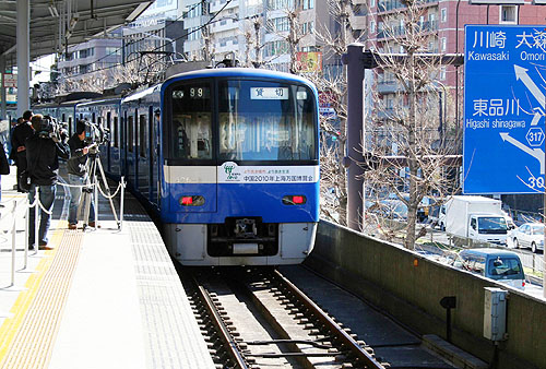 20日,“世博號(hào)”列車在日本首都東京緩緩駛?cè)胝九_(tái)。當(dāng)日,日本“上海周”主體活動(dòng)暨“迎世博·流動(dòng)的上!睌z影圖片展開幕式在日本東京舉行。這列標(biāo)飾有中國2010年上海世博會(huì)會(huì)標(biāo)的列車由8節(jié)車廂組成,車廂里布置了320幅有關(guān)上海城市風(fēng)貌、風(fēng)土人情、飲食風(fēng)味、世博展館等方面的彩色圖片。從3月16日至4月30日,“世博號(hào)”列車每日6次往返于東京與橫濱之間,將上海的魅力展現(xiàn)給廣大乘客。 |
