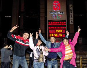 昨天(26日),幾名學生在中國國家博物館門前的2008年奧運會倒計時牌前歡呼留影。當晚,北京迎來2008年奧運會倒計時500天。