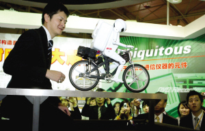 機(jī)器人騎車過橋展示通訊技術(shù)