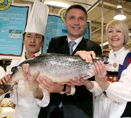 3月27日,挪威首相斯托爾滕貝格(中)在北京一超市內(nèi)展示來自挪威的三文魚。當日,挪威三文魚中國推廣活動在北京拉開帷幕,正在北京訪問的挪威首相斯托爾滕貝格及其一行親臨現(xiàn)場,品嘗三文魚食品,“推銷”挪威產(chǎn)三文魚。