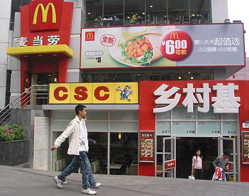 3月27日,兩位市民經(jīng)過重慶觀音步行街的快餐店,樓上是洋快餐“麥當勞”,樓下是本土快餐“鄉(xiāng)村基”,兩家快餐同樓競爭。