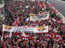 4月3日,在法國(guó)圖盧茲市的布拉尼亞克機(jī)場(chǎng)附近,歐洲空中客車公司的員工舉行游行示威,抗議空客的重組計(jì)劃。根據(jù)重組計(jì)劃,空客將在歐洲裁員一萬人,其中法國(guó)4300人。