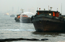 4月10日,參與清污行動(dòng)的船舶向污染水域噴射除油劑。4月9日21時(shí)30分,在上海黃浦江閘北2號(hào)泊位附近水域,出現(xiàn)大量油污。一艘船名為“上電油1221”的船舶在油艙之間駁油時(shí)發(fā)生溢油事故,初步判定泄漏重油約45.33噸。 上海海事局立即啟動(dòng)溢油應(yīng)急反應(yīng)預(yù)案,組織清污工作。目前,江面大部分油污已被清除,碼頭里檔以及岸線上的油污還在清除中。