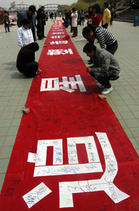 4月8日,一些年輕人在蘭州市濱河路“健康追星、理智追星、塑造完美人生”簽名活動(dòng)的橫幅上簽名。