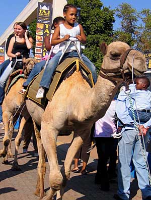 14日,在南非最大城市約翰內(nèi)斯堡舉行的金山商展上,人們爭著騎坐在南非很少見的駱駝。每年在復(fù)活節(jié)前后舉行的南非金山商展創(chuàng)始于1895年,被認(rèn)為是非洲規(guī)模最大的消費用品博覽會。2007年該商展有550多家國內(nèi)外廠商參展,將歷時近3周。本屆商展組織者精心安排了豐富多彩的文娛、游樂、餐飲等活動,吸引了大批民眾前來購物和休閑。