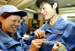 4月16日清晨,一名清道女工為新徒弟耿佳明戴上工號(hào)牌。當(dāng)日凌晨,上海市盧灣區(qū)市容管理局新錄用的26名大中專生和技校生清道工正式上崗。這批新錄用的員工中有六名是大專生。