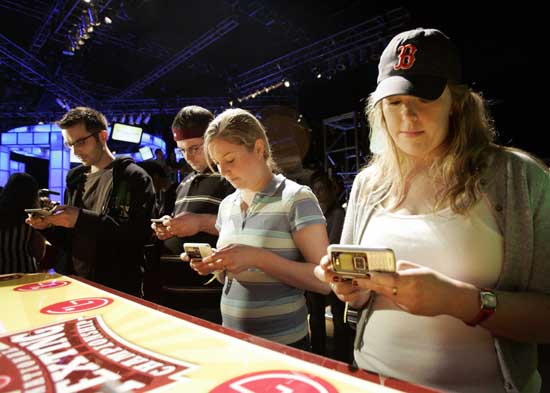 21日,在美國紐約,幾名參加手機短信比賽的選手在發(fā)短信。當(dāng)日,在一家手機公司舉辦的手機短信比賽上,一名來自賓夕法尼亞州的13歲的小女孩獲得“東海岸冠軍”。屆時,她將與來自洛杉磯的“西海岸冠軍”爭奪最后的勝利。