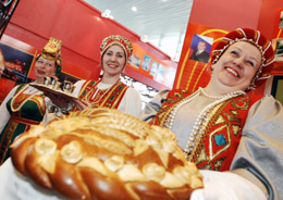 4月18日,俄羅斯客商在國際經(jīng)貿(mào)旅游節(jié)上展示俄羅斯食品。當日,2007中國·揚州“煙花三月”國際經(jīng)貿(mào)旅游節(jié)在瘦西湖萬花園景區(qū)開幕。