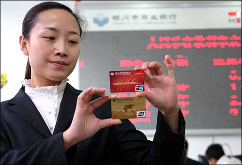 4月23日,銀川市商業(yè)銀行工作人員對比新舊銀聯如意借記卡。中國銀聯從7月1日起,將停止“94”字頭如意借記卡的跨行取款和刷卡消費業(yè)務。新卡片磁條信息上除了記錄持卡人的個人資料之外,還添加有CVN校驗碼,該校驗碼是防范克隆卡和偽卡交易的重要手段,可保護持卡資金安全。凡持“94”字頭的如意借記卡客戶須到銀行各網點免費更換新標準如意借記卡。