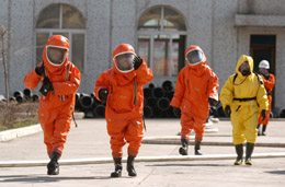 4月25日,身著防護(hù)服的消防隊(duì)員走出事故現(xiàn)場(chǎng)。當(dāng)日上午9時(shí)左右,黑龍江省依蘭縣自來水廠一車間內(nèi)發(fā)生氯氣泄漏,當(dāng)?shù)匾殉闪⒕o急指揮部疏散附近群眾。目前,氯氣泄漏已經(jīng)得到控制。