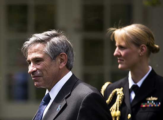 25日,世界銀行行長保羅·沃爾福威茨(左)在美國華盛頓白宮參加活動。歐洲議會當天要求世界銀行行長沃爾福威茨辭職,向這名陷入“女友門”丑聞的高官施加更大壓力。