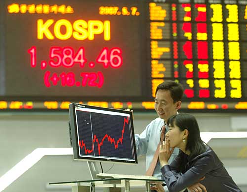 7日,韓國工作人員在首都首爾的證券交易所內查看股票價格。當天,韓國首爾股市綜合指數(shù)以1584.46點收盤,創(chuàng)歷史新高。