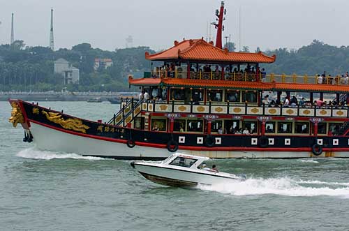 5月6日,一艘游船載著游客游覽金廈海峽。五一黃金周,廈門(mén)市“游金廈海峽,覽兩岸風(fēng)光”旅游項(xiàng)目吸引了四面八方的游客,5月1日至6日,乘游船游覽金廈海峽,從海上看金門(mén)的游客達(dá)4萬(wàn)多人次。