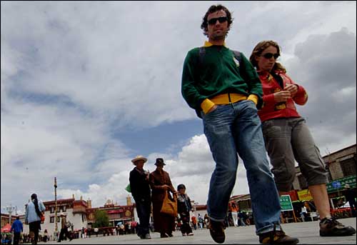 5月1日,兩名外國游客從大昭寺廣場(chǎng)前走過!拔逡弧甭糜吸S金周期間,西藏共接待游客33.9695萬人次,比上年同期增長(zhǎng)32.6%;旅游總收入首次突破一億元,達(dá)到13556萬元,同比增長(zhǎng)31%。