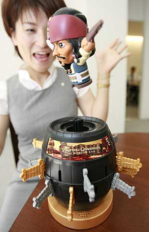 日本東京一家玩具公司的職員演示該公司新推出的玩具“海盜飛人”。這款玩具根據(jù)電影《加勒比海盜》設(shè)計(jì),海盜小人以影片主人公杰克船長(zhǎng)為原型。如果玩家拔錯(cuò)插在桶上的刀,藏在桶中的杰克船長(zhǎng)就會(huì)飛出來(lái)。