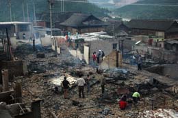 15日,村民清理被燒毀的民房。當(dāng)日凌晨1時(shí)30分許,貴州省凱里市舟溪鎮(zhèn)果園村發(fā)生火災(zāi),八戶民房被燒毀,幸無(wú)人員傷亡。據(jù)調(diào)查,火災(zāi)是由于民房上空高壓線脫落并造成短路引發(fā)的。