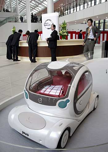 15日,在日本神奈川縣厚木市日產(chǎn)公司高科技中心,參觀者走過一款名為“Pivo”的概念電動(dòng)車模型。該車車廂可以360度旋轉(zhuǎn),免除了倒車的麻煩。當(dāng)日,日產(chǎn)汽車公司高科技中心向公眾開放,該中心致力于推動(dòng)環(huán)保型汽車的發(fā)展。