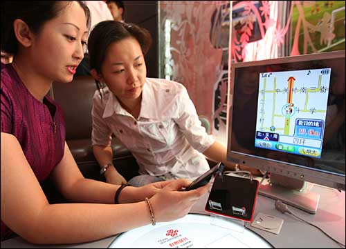 5月17日,一名工作人員在為參觀(guān)者展示手機(jī)的電子導(dǎo)航功能。當(dāng)日,中國(guó)聯(lián)通與美國(guó)某公司在北京中關(guān)村建成CDMA體驗(yàn)中心。