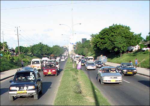 自21日開始,坦桑尼亞達(dá)累斯薩拉姆市開始采用“借道行車”的方案,解決坦桑尼亞第一大城市達(dá)累斯薩拉姆上下班交通高峰期擁堵問題。該方案規(guī)定,每逢上下班交通高峰期,進(jìn)城或出城的方向可以向逆向借用一個(gè)車道。圖為達(dá)累斯薩拉姆市采用新的行車方案后交通高峰時(shí)的道路行車情況。