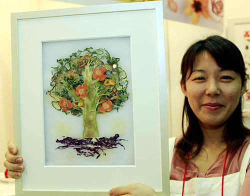 在日本東京開幕的一個手工藝品展上,一名參展者展示用胡蘿卜、花菜等制作的裝飾畫。這種蔬菜藝術(shù)品制作方法簡單,只需將日常食用的蔬菜切片,用微波爐加熱變軟,然后剪切成各種形狀風(fēng)干定形,最后粘貼成各種漂亮的藝術(shù)品。蔬菜藝術(shù)品一經(jīng)亮相便受到眾多觀眾的歡迎。