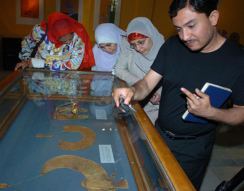 10日,游客在埃及首都開羅的埃及國家博物館觀看古埃及法老圖坦卡蒙珍寶展覽。當日,為期3個月的古埃及法老圖坦卡蒙珍寶展覽在埃及國家博物館開幕,一批圖坦卡蒙墓出土的珍寶及木乃伊飾物被展出。