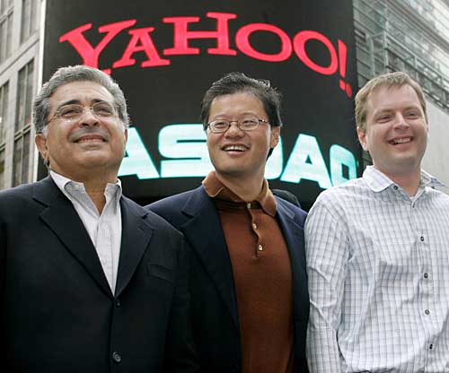 美國(guó)著名網(wǎng)絡(luò)搜索公司“雅虎”6月18日宣布重大高層變動(dòng),原任董事長(zhǎng)兼首席執(zhí)行官的特里·塞梅爾辭去首席執(zhí)行官職務(wù),公司創(chuàng)始人之一、美籍華人楊致遠(yuǎn)出任首席執(zhí)行官,從而重掌雅虎門戶。這張2005年3月2日拍攝的資料照片顯示,楊致遠(yuǎn)(中)與塞梅爾(左)以及“雅虎”公司另一創(chuàng)始人菲洛在美國(guó)時(shí)報(bào)廣場(chǎng)合影。