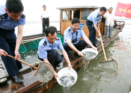 當日,蘇州市漁業(yè)部門在八處太湖水域主要河道同時展開大規(guī)模漁業(yè)資源增殖放流活動。其中,漁政人員共放流食用浮游生物的白鰱、花鰱等魚苗160多萬尾,以控制該地區(qū)的太湖藍藻。