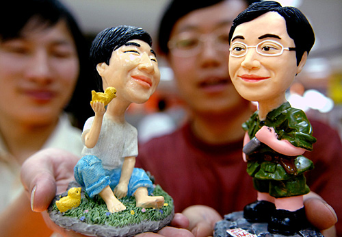 近日,寧夏銀川一家禮品店推出卡通人像雕塑項(xiàng)目,只需一張照片就能為顧客“克隆”出惟妙惟肖的卡通造型,受到眾多年輕人的歡迎。圖為顧客在展示各自的軟陶卡通雕塑。