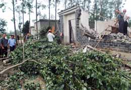 7月4日,救援人員清理在龍卷風(fēng)襲擊中受損的房屋。7月3日16時(shí)40分左右,一股特大龍卷風(fēng)襲擊了江蘇省高郵市湖西地區(qū),造成七人死亡,53人受傷,其中重傷12人。