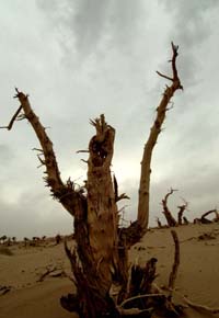 額濟(jì)納綠洲過去有75萬木胡楊林和200多萬畝紅柳等灌木林。由于黑河水無度地被使用,導(dǎo)致下游斷流,1992年綠洲的命脈居延海干涸,胡楊林面積下降到35萬畝,紅柳等灌木林也不足百萬畝,額濟(jì)納綠洲的生態(tài)惡化,導(dǎo)致阿拉善地區(qū)的生態(tài)產(chǎn)生連鎖性惡化,成為威脅華北和西北的沙塵源地。從2003年起,國家實(shí)施了黑河分水、節(jié)水等工程,使居延海重新恢復(fù)了部分水域面積,額濟(jì)納綠洲也逐步遏制住了縮小的趨勢,但綠洲上留下的一片片枯死的胡楊成為了警示后人的警示錄。 |