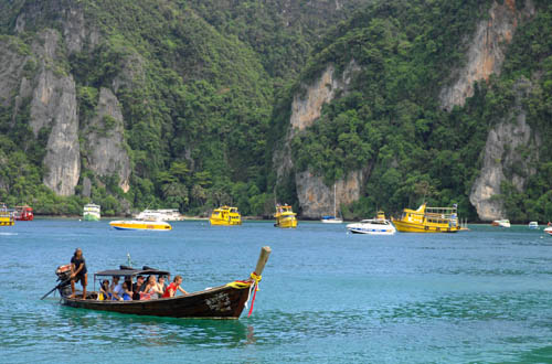 14日,游客乘船游覽泰國(guó)南部甲米府的披披島。經(jīng)過(guò)兩年多的重建,當(dāng)?shù)卦馐苡《妊蠛[嚴(yán)重破壞的旅游業(yè)正在逐步恢復(fù),披披島今年第二季度日均游客接待量已經(jīng)超過(guò)海嘯前的同期水平。