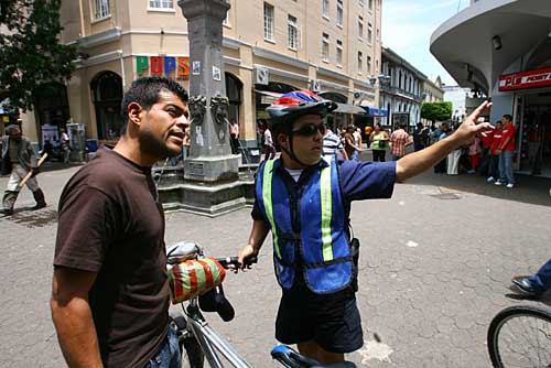 16日,一名騎自行車的哥斯達(dá)黎加警察在首都圣何塞市中心的步行街上接受市民咨詢。哥斯達(dá)黎加是世界上少數(shù)沒有軍隊(duì)的國(guó)家之一,其警察部隊(duì)有數(shù)萬人,擔(dān)負(fù)著國(guó)家的社會(huì)治安和邊境安全等任務(wù)。