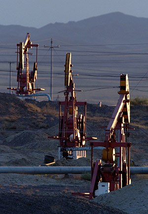 7月16日,在新疆克拉瑪依郊區(qū),抽油機(jī)在作業(yè)。新疆石油工業(yè)經(jīng)過(guò)半個(gè)世紀(jì)的發(fā)展,原油日產(chǎn)突破7萬(wàn)噸,目前一天原油產(chǎn)量已超過(guò)1953年全年產(chǎn)量。