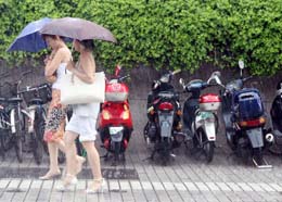 7月29日,兩位女士在雨中行走。當(dāng)日,上海持續(xù)約半小時的陣雨并未緩解暑熱。據(jù)上海中心氣象臺消息,當(dāng)日上海最高氣溫達(dá)39.6攝氏度,為今夏最高紀(jì)錄。